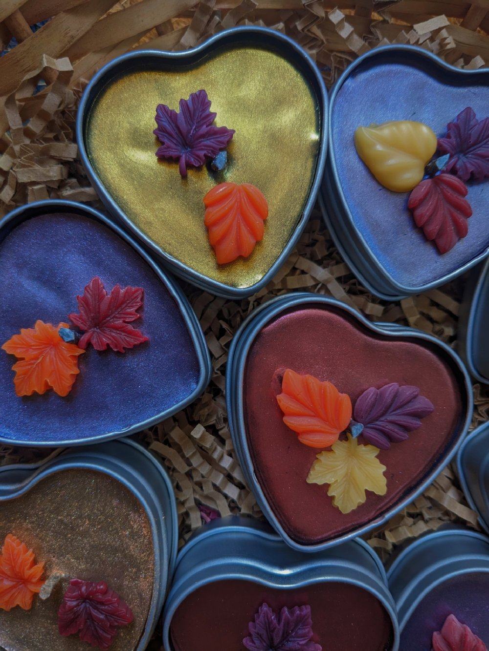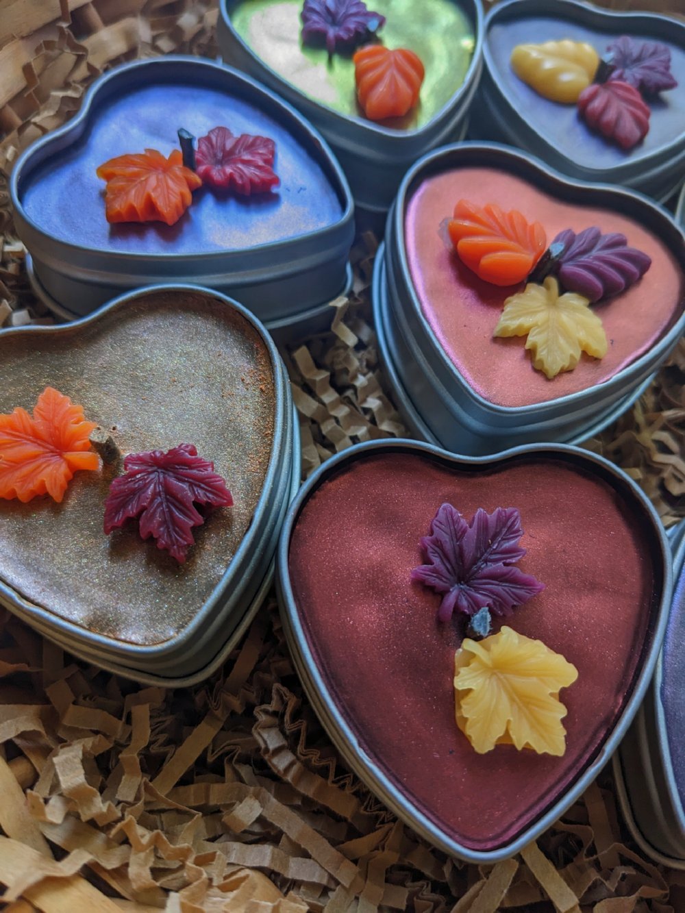 These heart tins are 100% beeswax, painted with mica powder, scented with "autumn wreath" fragrance oil, and decorated with fall leaf wax decor.
