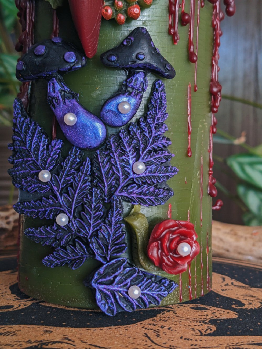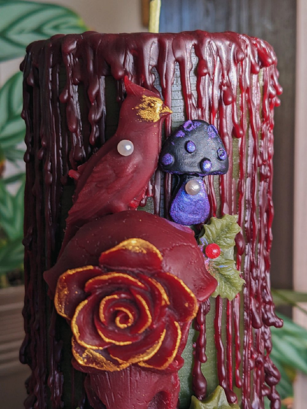 A 9" olive green pillar with burgundy drip, wax decor (crow, mushrooms, snail, roses, ferns, cardinal, mistletoe), & decorated with mica powder.