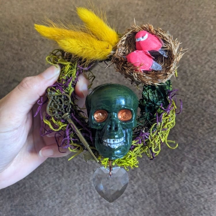 Wreath is decorated with moss, green skull, bunny tails, pink birds nest, a copper key, and a heart-shaped chandelier crystal.