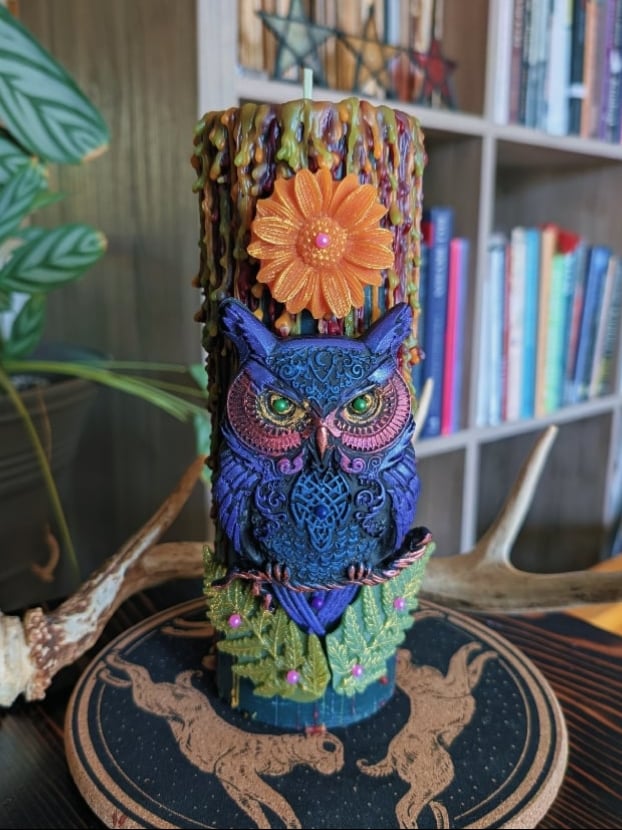 A 9" teal pillar with burgundy, orange, purple, and olive green drip, wax decor (owl, sunflower, ferns), and painted with mica powder.