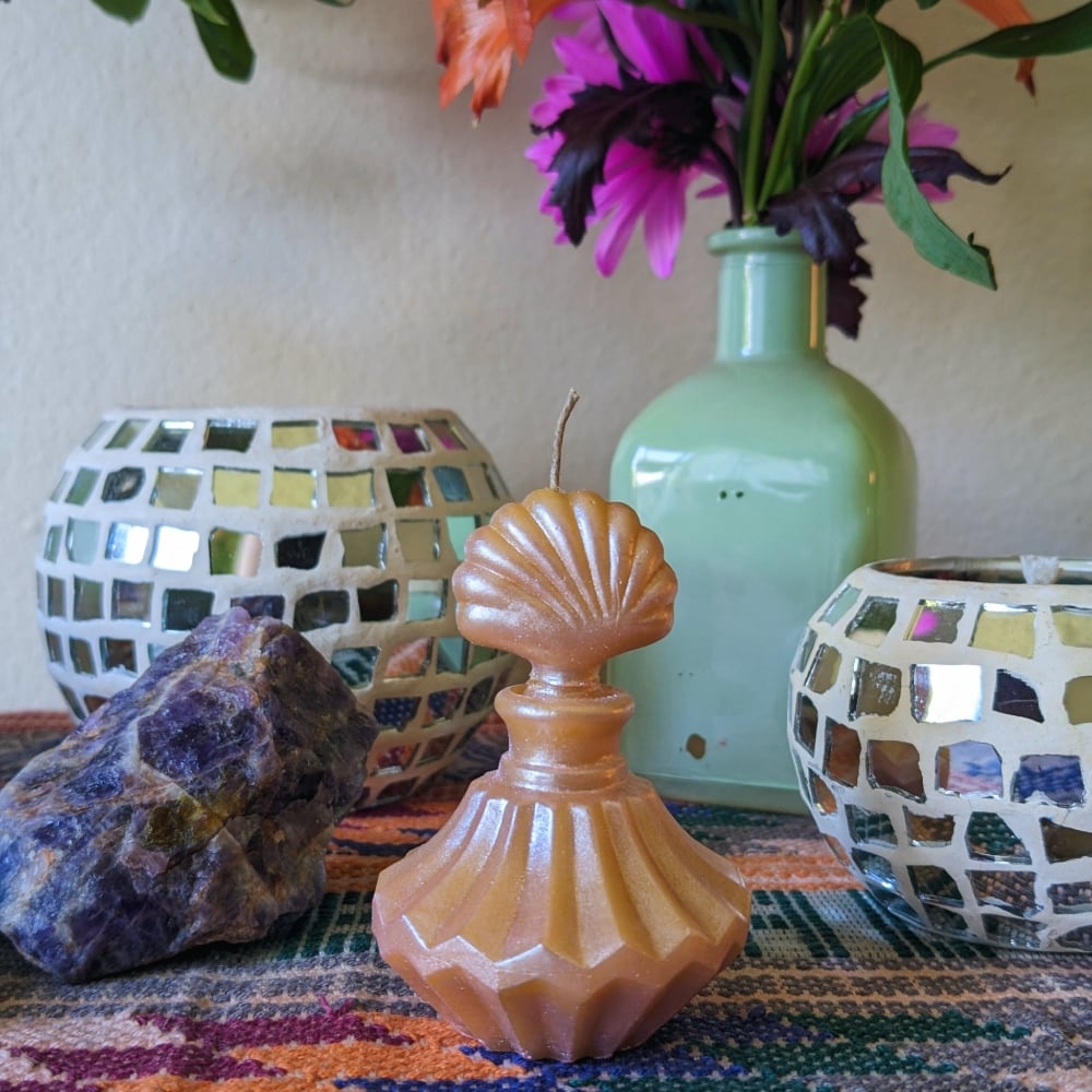 100% beeswax. Unscented. Comes with a tiny altar spoon. This candle is made to order and will ship 10 days after ordering.