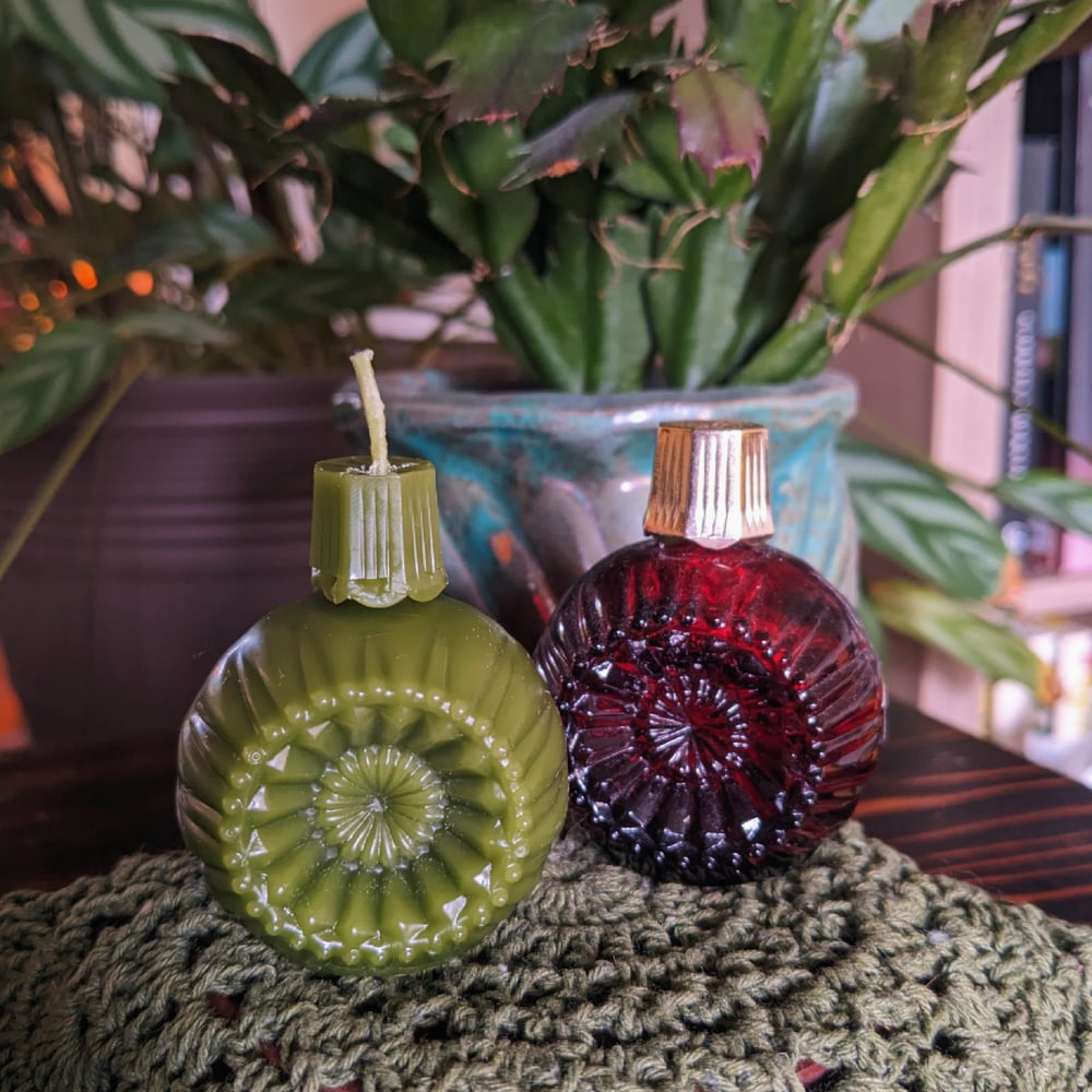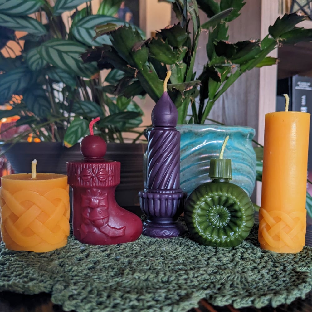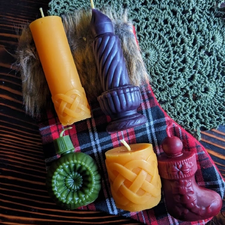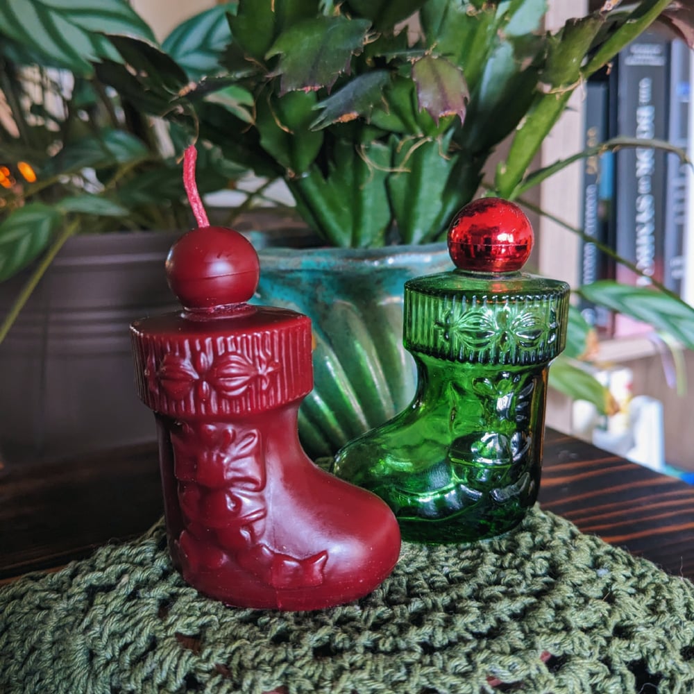 A set of 5 original candles molded from Avon perfume bottles and two Celtic Knot candles (votive and mini pillar), stuffed in a plaid and fur stocking.